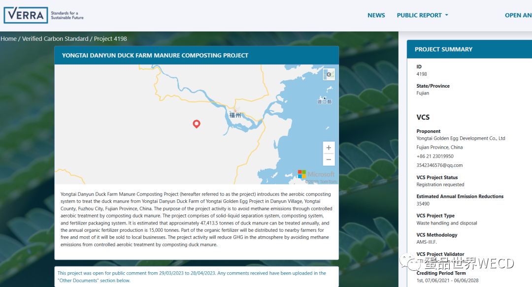近日,由永泰县金蛋发展有限公司开发的蛋鸭粪污资源化利用VCS项目,在Verra官网结束了为期一个月的公示。该项目利用高温好氧发酵堆肥系统,可有效减少温室气体甲烷的排放量。减排量将于近期签发并上线交易,这也是福建首个水禽粪污利用碳减排交易项目。